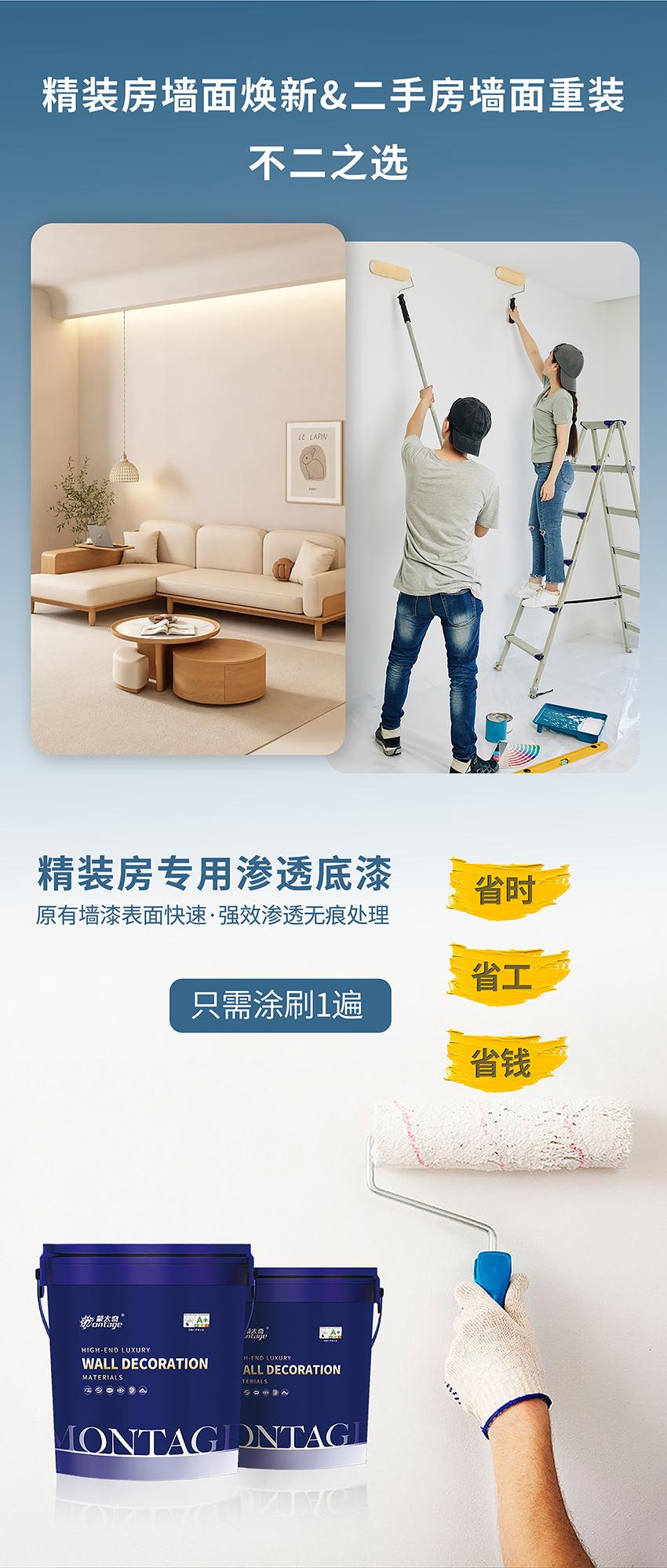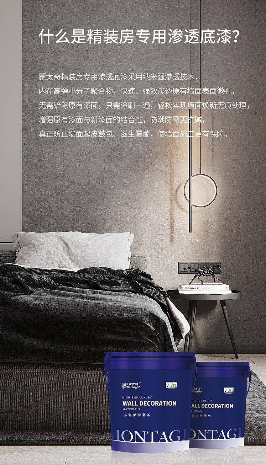 為了全方位解決精裝房或二手房客戶家裝煥新需求,針對原有乳膠漆墻面常見的起皮、裂紋、返堿等問題隱患,蒙太奇推出新品——精裝房滲透底漆。