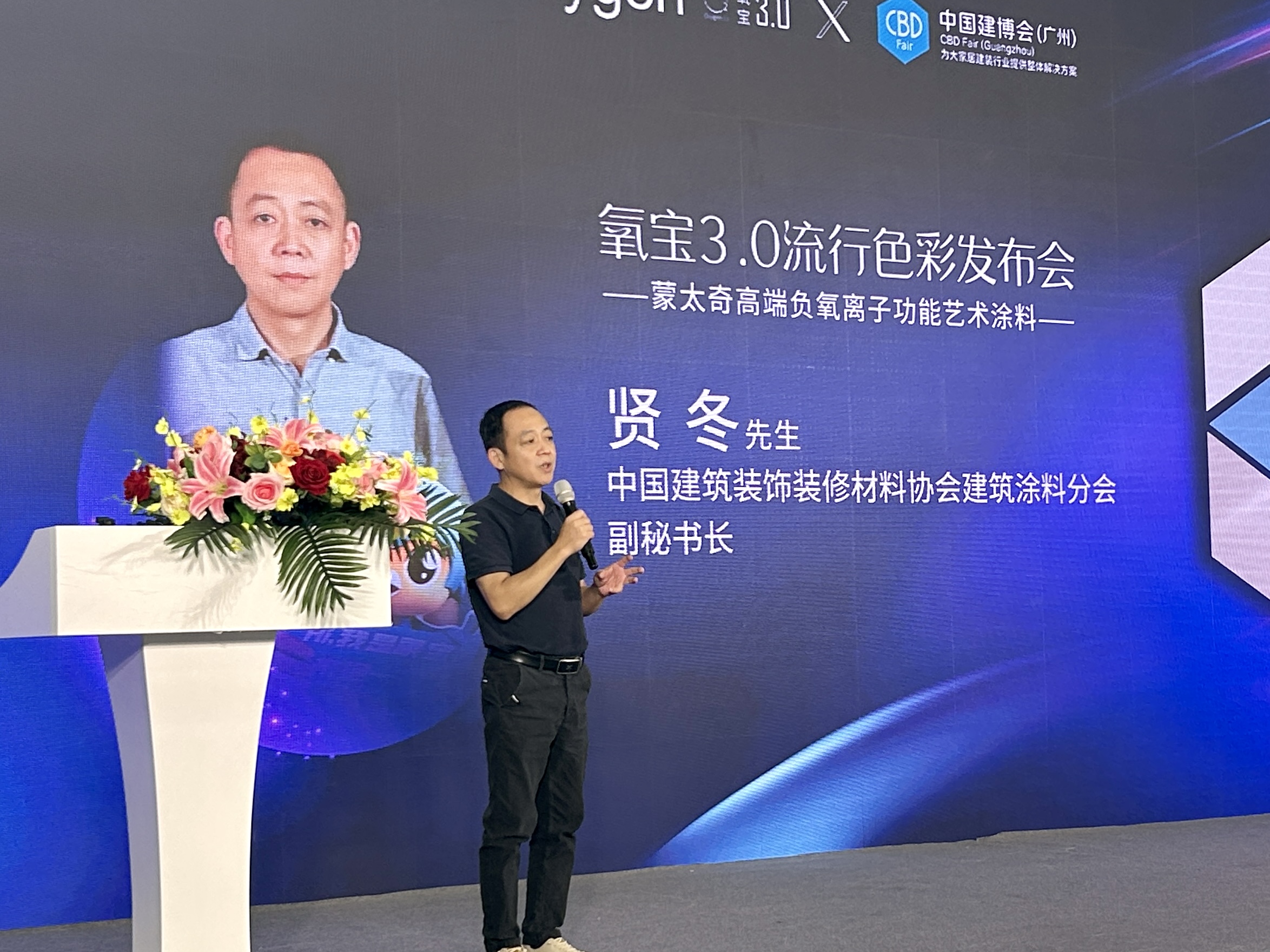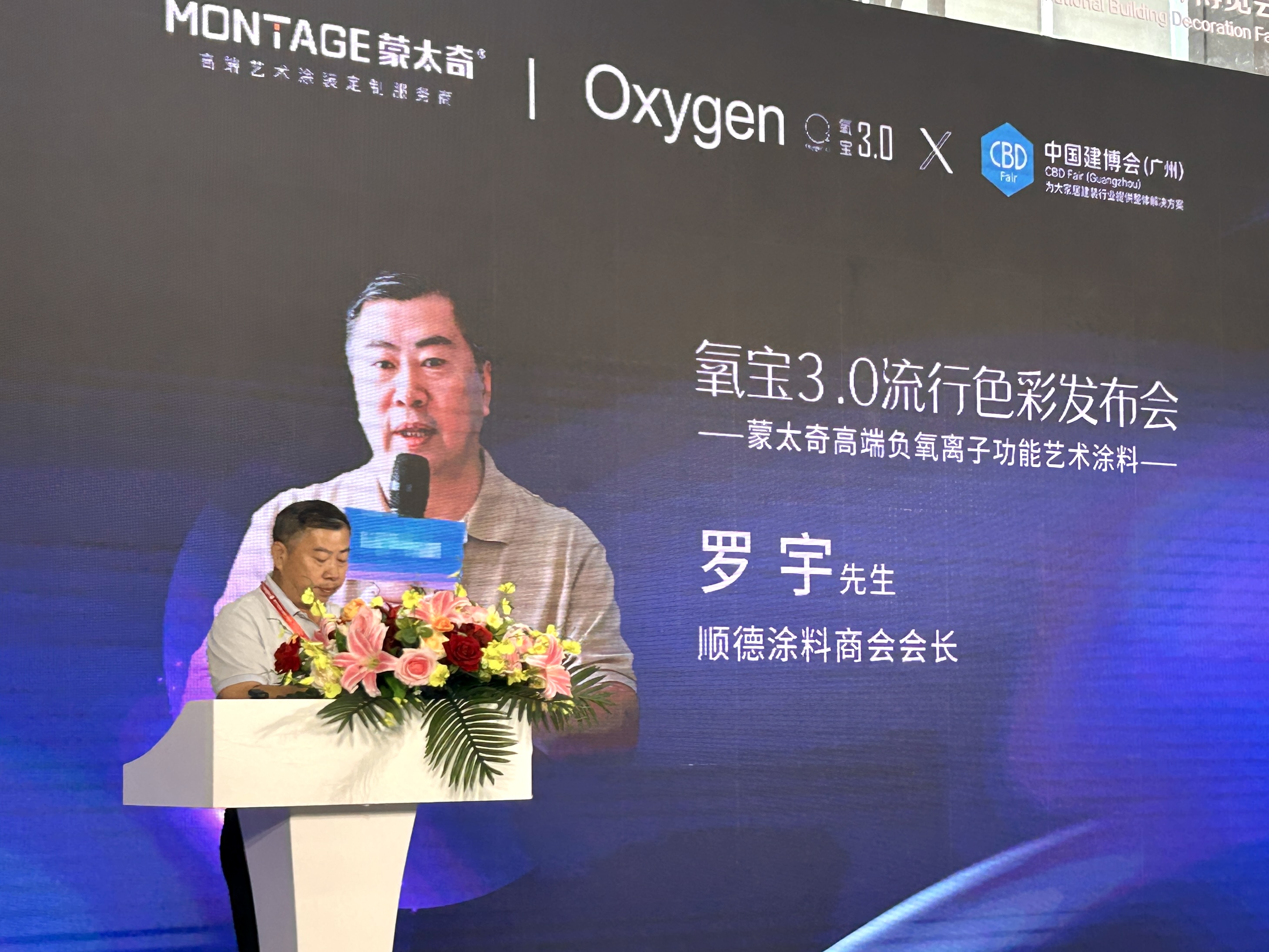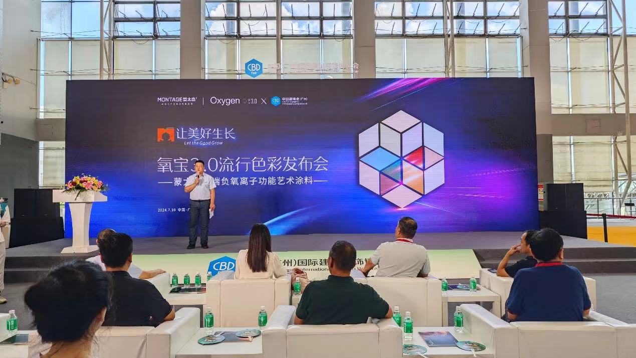 2024年7月10日上午10:45-11:45, 2024年中國建博會(廣州)第二屆中國藝術涂料節活動專區,蒙太奇“氧寶3.0負氧離子高端功能藝術涂料流行色彩發布會”圓滿落幕,順德涂料商會會長羅宇先生、秘書長張夢東先生、中國裝修裝飾材料協會建筑涂料分會副秘書長賢冬先生等協會領導蒞臨發布會