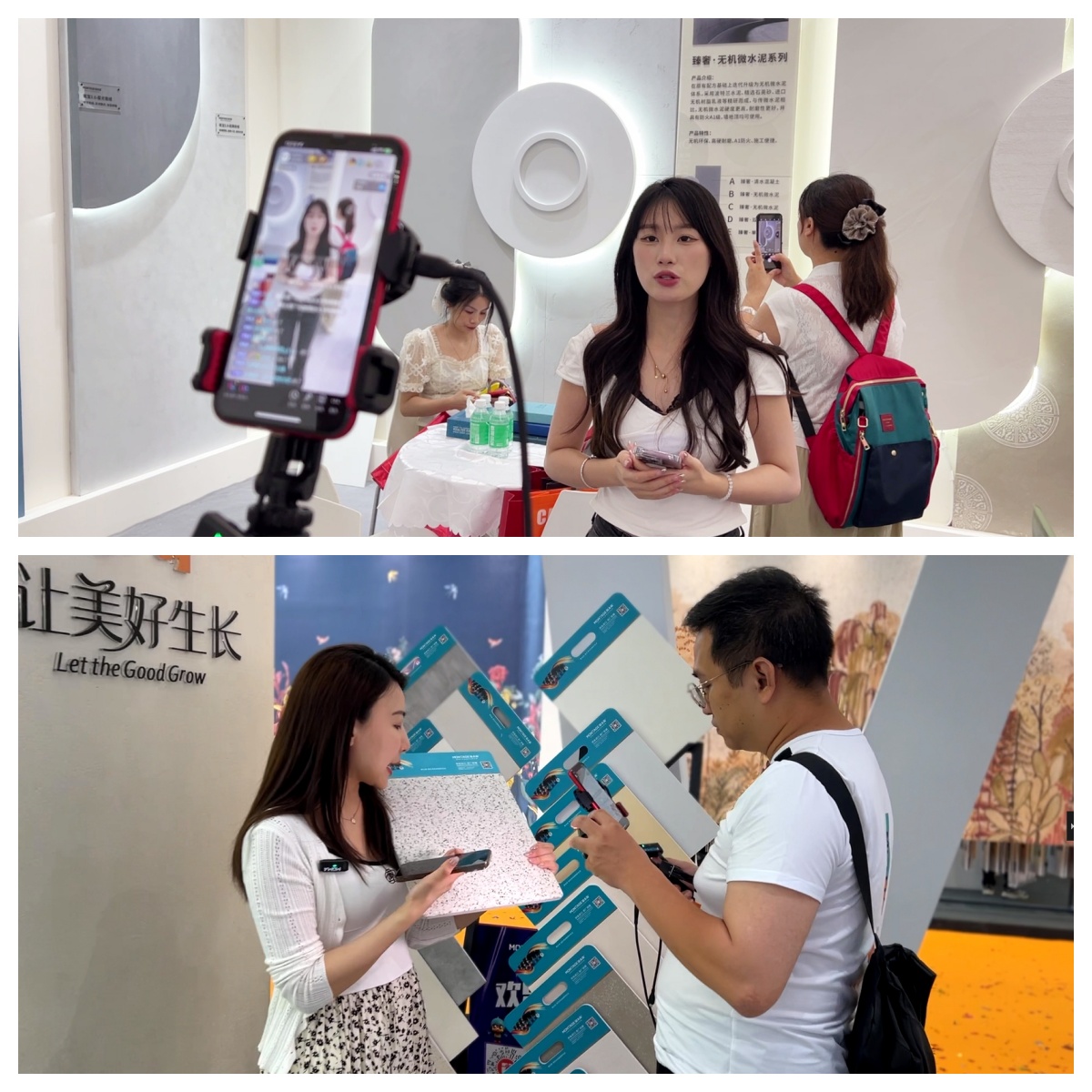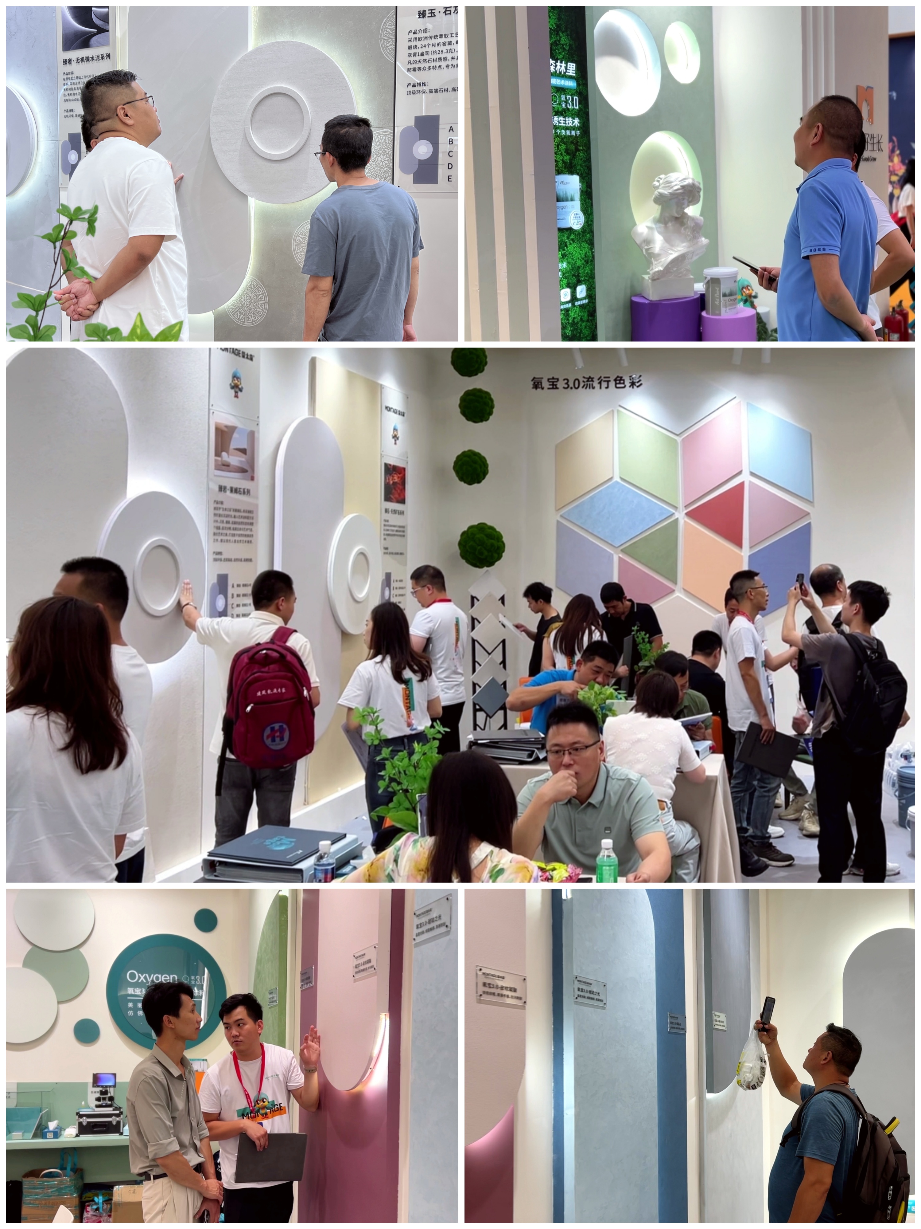 蒙太奇憑借強(qiáng)勁的品牌號(hào)召力,展位內(nèi)人海如潮,咨詢者絡(luò)繹不絕。其中,氧寶3.0高端功能藝術(shù)涂料體驗(yàn)區(qū)、臻石高定石材藝術(shù)涂料體驗(yàn)區(qū)、原裝進(jìn)口高定工藝藝術(shù)涂料體驗(yàn)區(qū)尤為熱鬧,每一款產(chǎn)品墻都展現(xiàn)了獨(dú)特的美感,吸引了眾多參觀者云集,讓觀眾零距離、沉浸式感受“會(huì)呼吸”的墻。