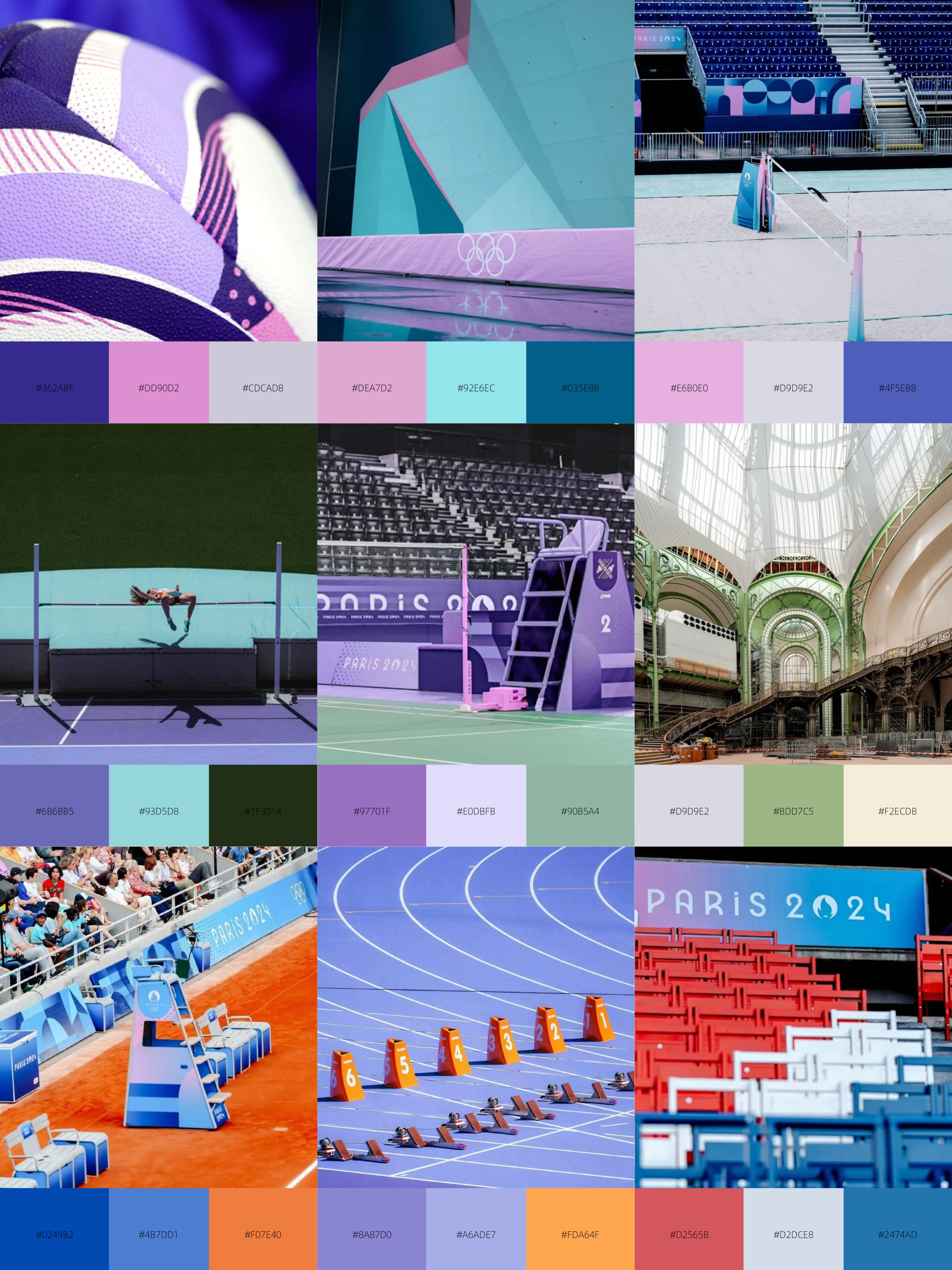 本屆奧運會所有場地設備與器械的配色高度還原并延伸了主視覺的色彩體系,尤其是在紫色系、橙色系和綠色系的色階延展與組合銜接上,做得非常大膽。除了紫色與橙色的俏皮搭配,將浪漫的紫、充滿生機的綠完美融合,同樣能營造出優雅又充滿活力的氛圍。