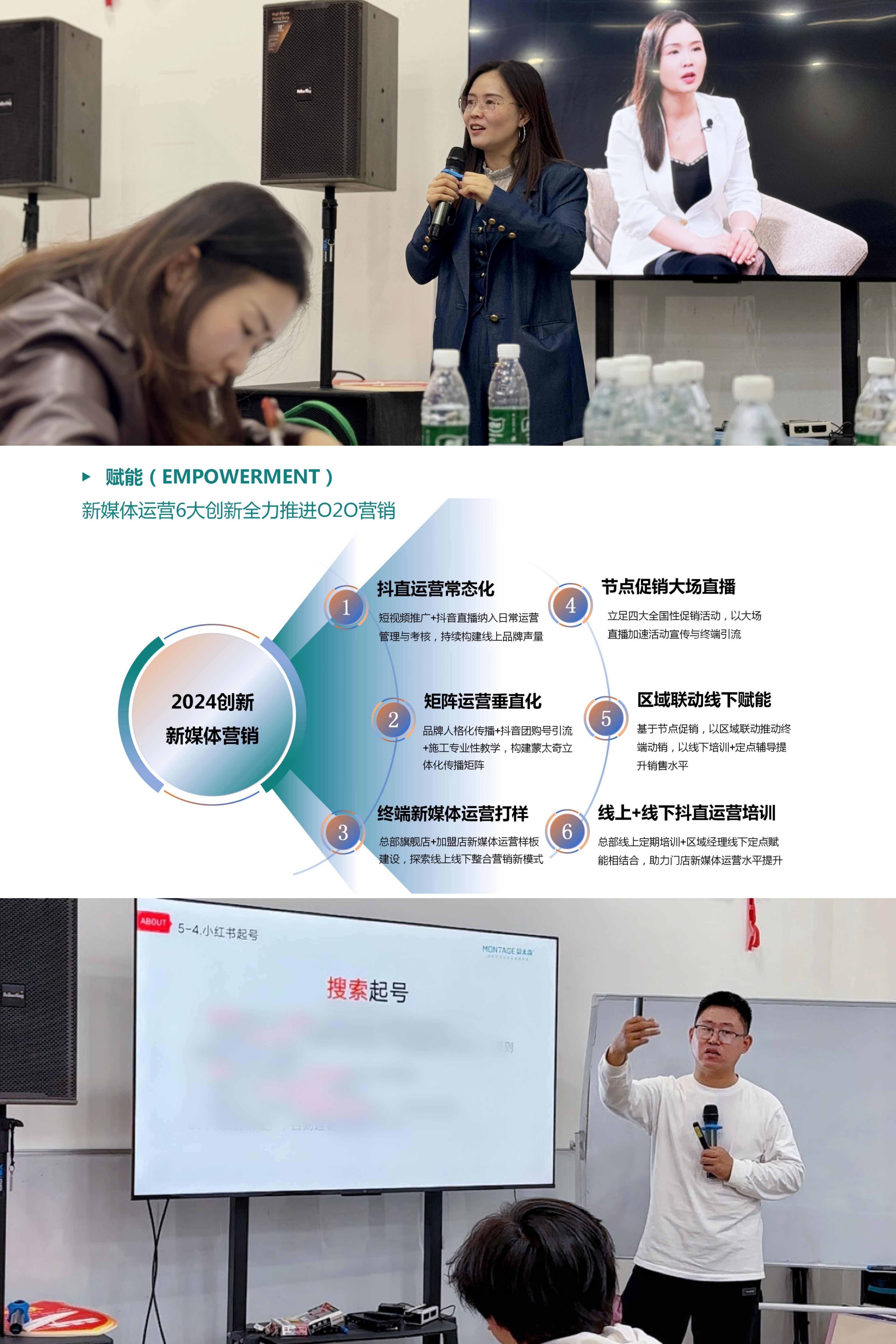下午的新媒體實戰運營培訓中,蒙太奇新媒體運營總監唐群分別針對抖音、小紅書、視頻號這三個平臺的基礎知識、運營規則以及廣告投放技巧等理論知識進行了分享。同時,還結合了蒙太奇在各平臺賬號從0到1的成長實戰經驗,為經銷商家人們進行了全面且深入的授課。助力各經銷商打通各平臺的底層邏輯,從而更好地擁抱新媒體平臺。