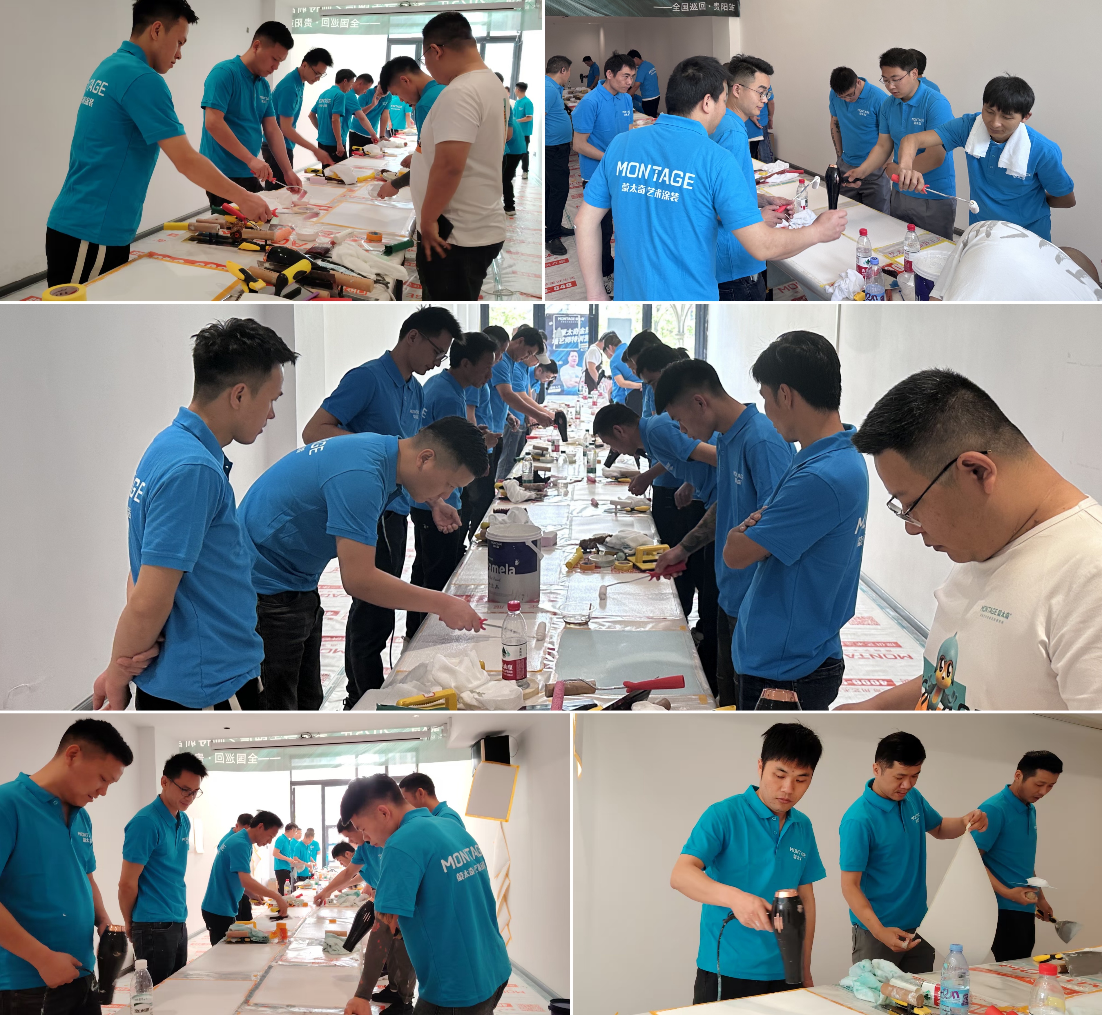 蒙太奇的墻藝師都需經(jīng)過專業(yè)技術(shù)培訓(xùn)和嚴(yán)苛的考評合格后才能上崗。隨著越來越多的新產(chǎn)品與新工藝浮現(xiàn)市場,作為專業(yè)的墻藝師,在鞏固現(xiàn)有施工技術(shù)的同時,更要熟練掌握新工藝的施工手法,不斷提升自身技能。