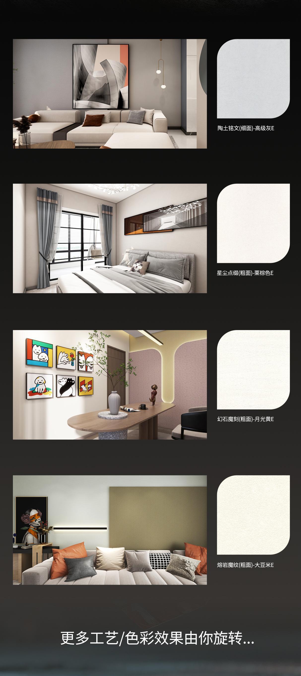 √ 底料+面漆自由組合,面層仍可無限疊加不同藝術效果,這種持續進化能力真正做到 “一套魔方涂裝系統,解鎖空間百變”。