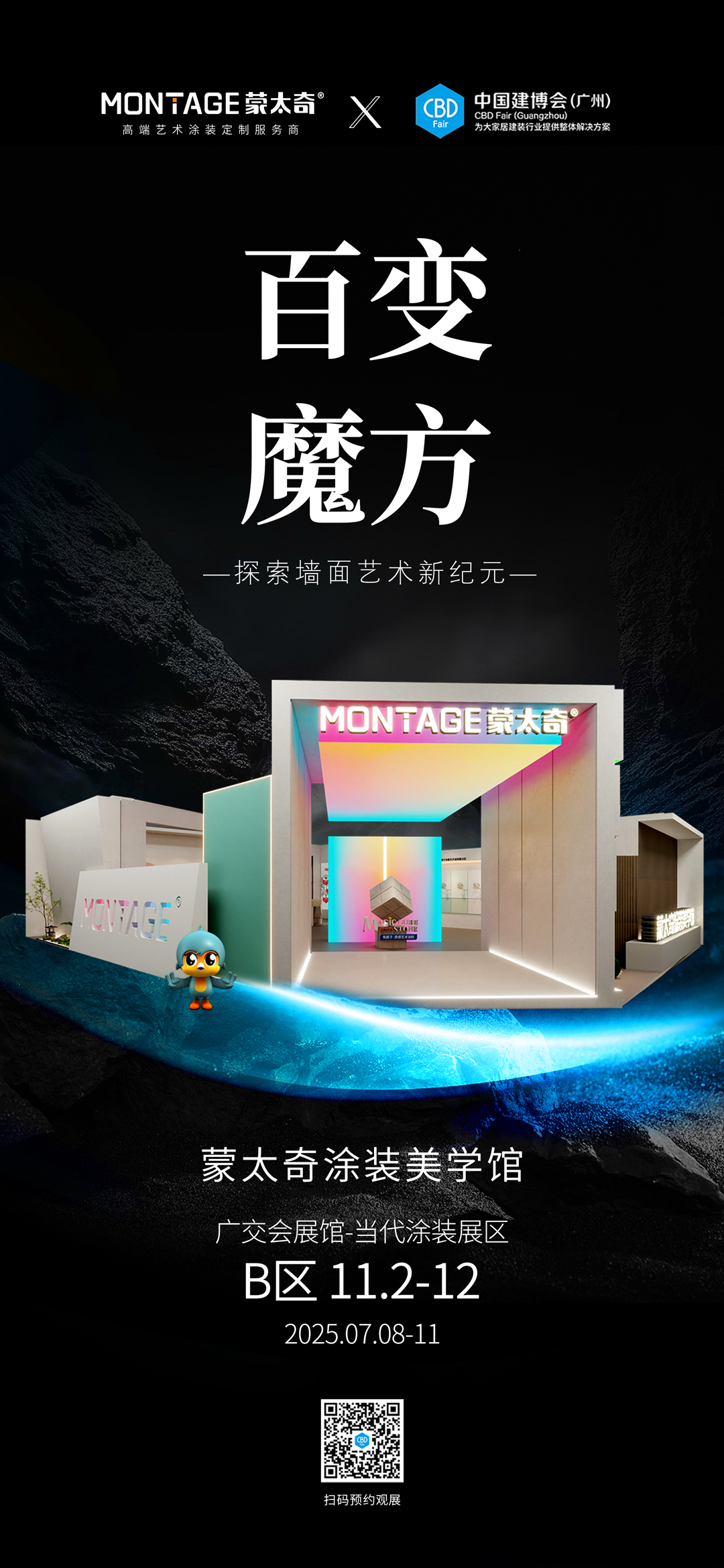 2025 年 7 月 8 日 - 11 日,亞洲規模最大、品類最全、影響力首屈一指的建筑裝飾領域頂級盛會——第 27 屆廣州建博會將震撼上演。作為藝術涂裝專業強勢品牌,蒙太奇將以“百變魔方石·藝術煥家妝”為主題,從產品創新到工藝革新,從色彩美學到空間藝術,從功能突破到場景表達,從藝術涂裝靈感到材料科技應用,攜5大亮點與您共賞一段“魔方”煥家妝之旅。
