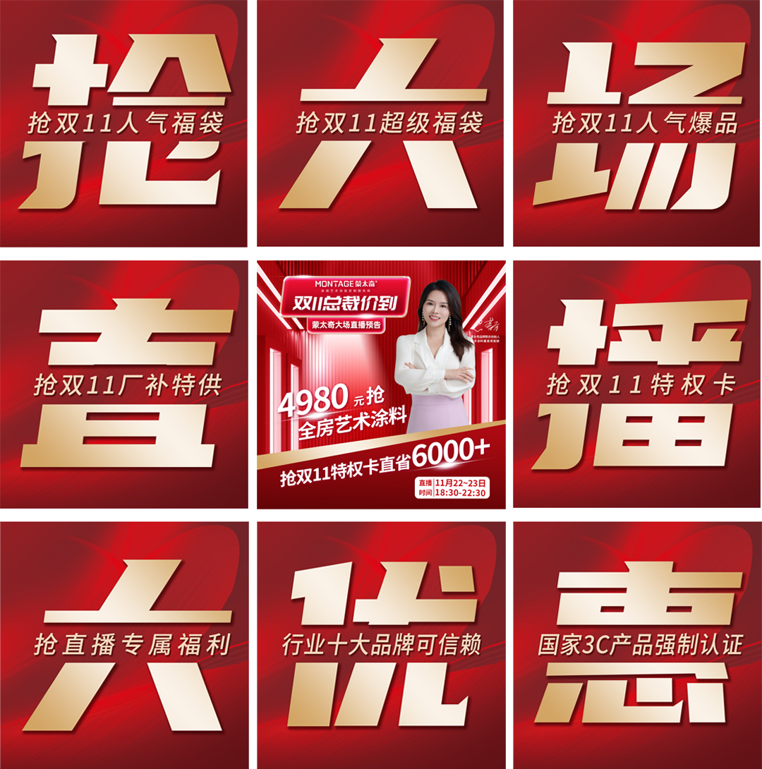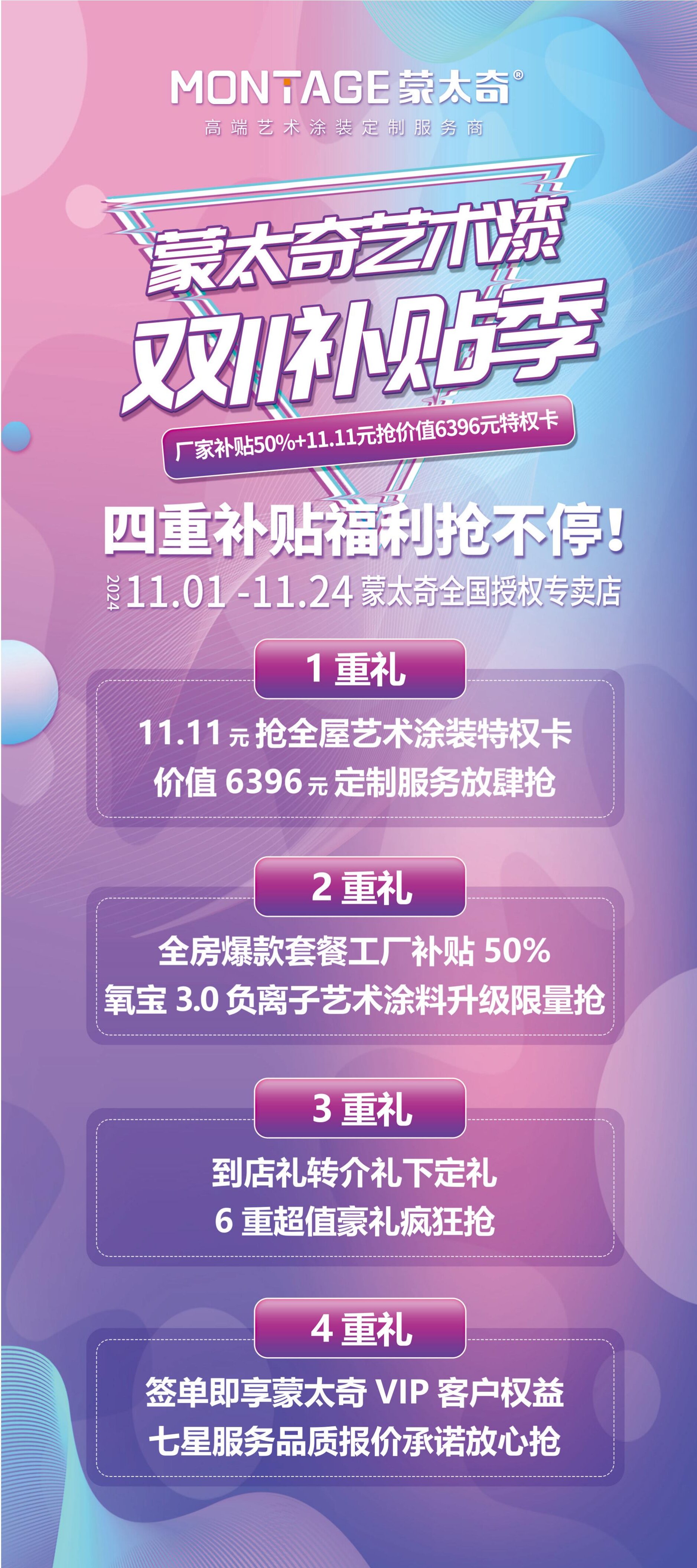蒙太奇此次雙11補貼季全國大促,緊跟國家家居建材綠色產品補貼腳步,推出四重補貼優惠政策,最高直補50%,更推出“全屋藝術涂裝定制特權卡”服務,活動期間,只需11.11元即可享受6396元的高端定制服務,讓消費者切實感受到了鉅惠風暴力度,真正做到了全屋藝術涂裝煥新超級?。?/font>