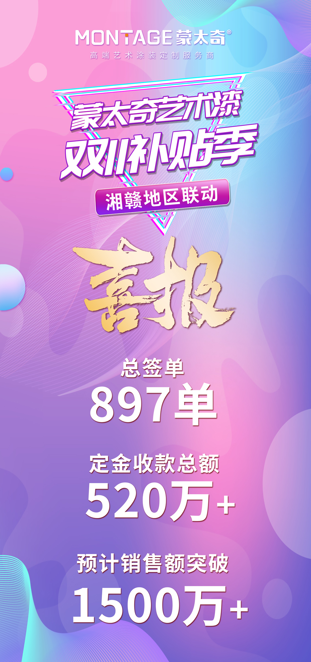 11月1日至24日,蒙太奇雙11補貼季活動圓滿落下帷幕。在此次大促活動中,湘贛區域再度聯手,取得了耀眼佳績,累計簽單897單,定金收款總額520萬+,預計銷售額突破1500萬+,這是湘贛區域繼蒙太奇十一全國大促活動以來再次取得銷售佳績。