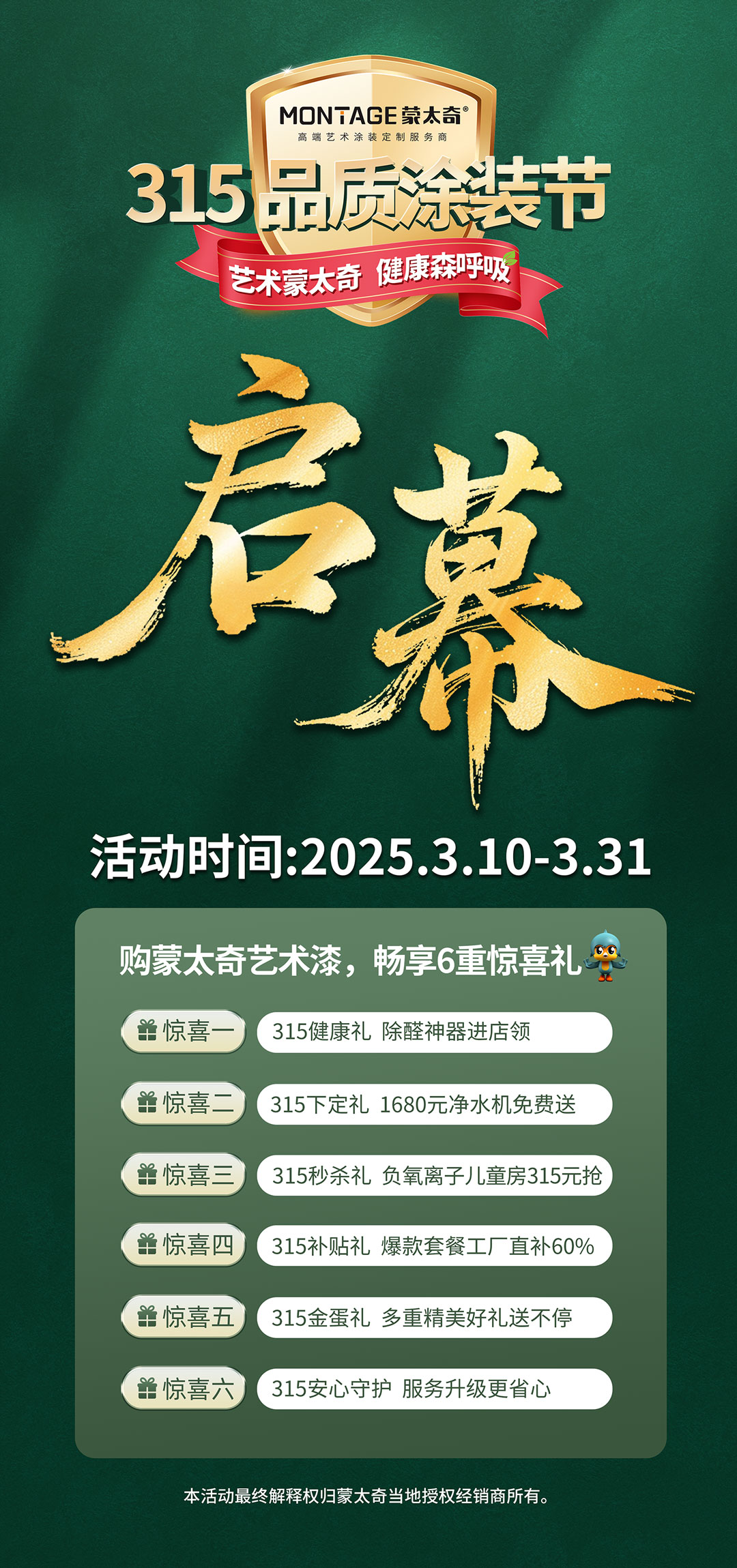 當(dāng)政策紅利遇上315煥新剛需,蒙太奇于3月10日至31日重磅推出“315品質(zhì)涂裝節(jié)”活動。作為2025年的首波盛惠,總部牽頭聯(lián)動全國多家終端門店,為全國消費者帶來前所未有的優(yōu)惠與驚喜。