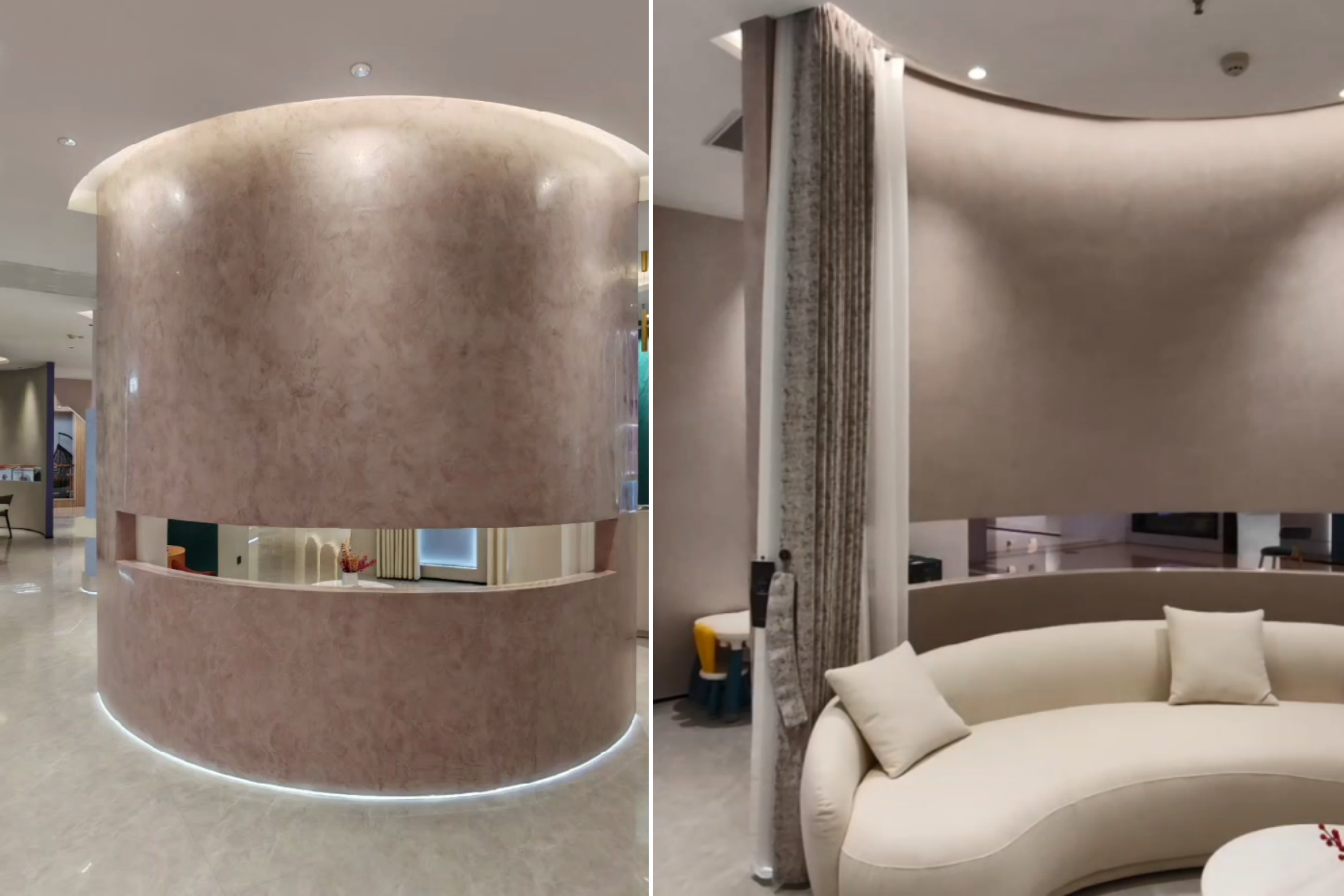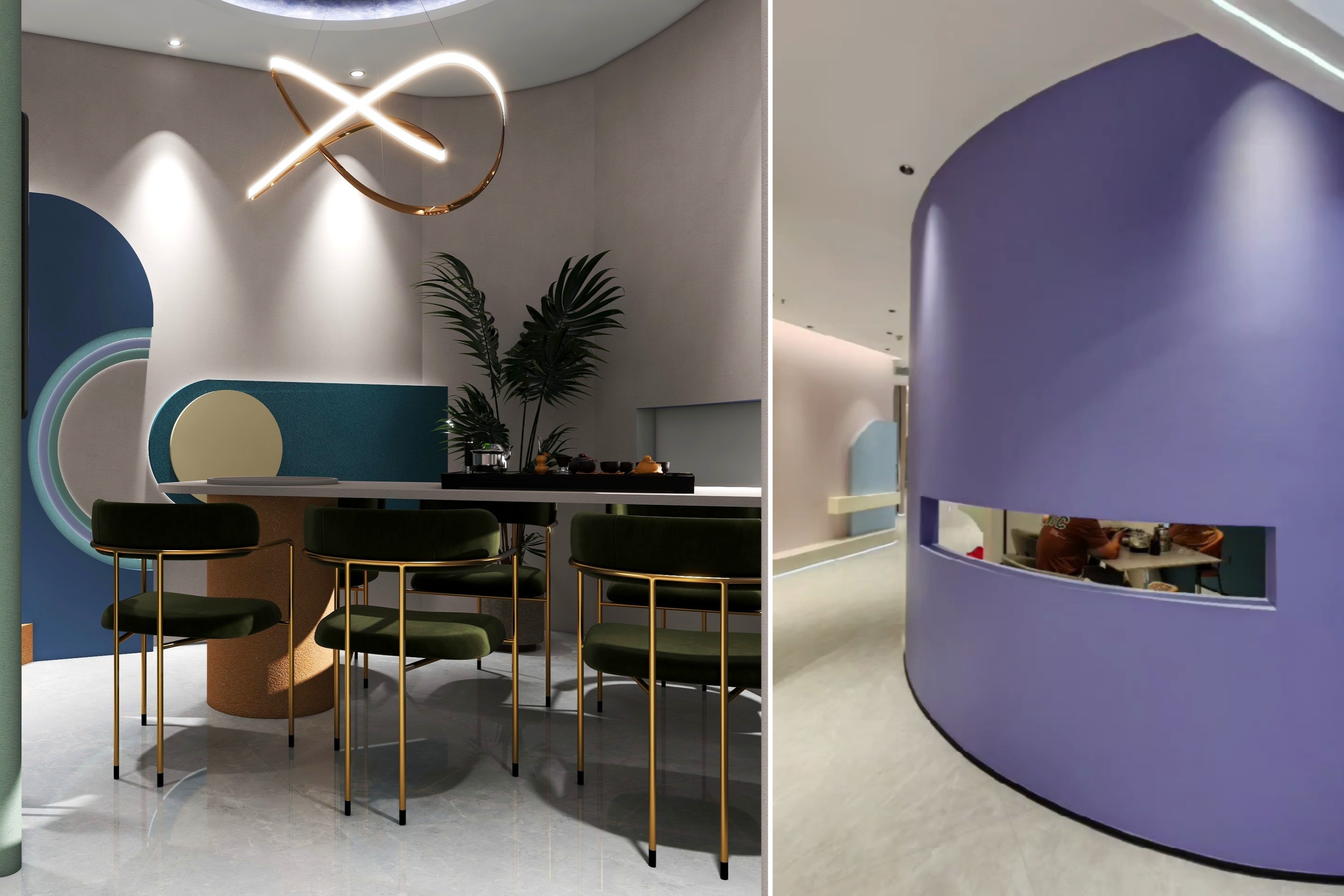 接待區(qū)旁邊的沙發(fā)休閑區(qū),將溫柔的莫蘭迪色調(diào)與流線型曲面墻,呈現(xiàn)出蜿蜒的視覺效果,猶如卷起舞臺幕布的一角,不僅增添了空間的層次感,更讓整個空間鮮活起來。